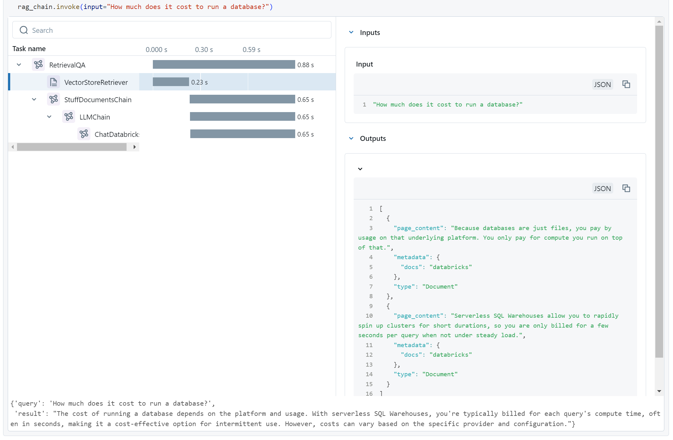 When we run this, MLFlow Tracing tracks how all the components of our chain invoke each other, and what their inputs and outputs are. It stores this data in a resilient location, but also conveniently displays it right away for us.