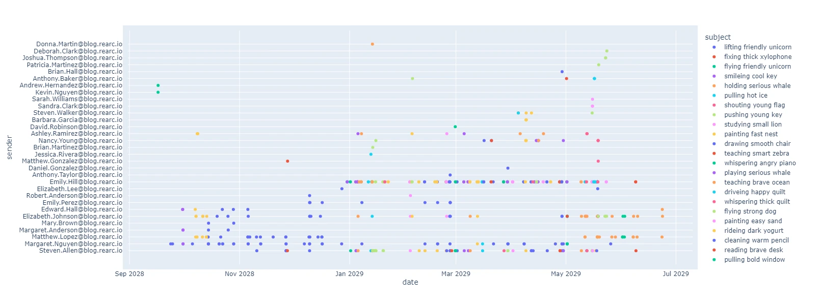fig = px.scatter(df, x="date", y="sender", color="subject", hover_data=["subject"])